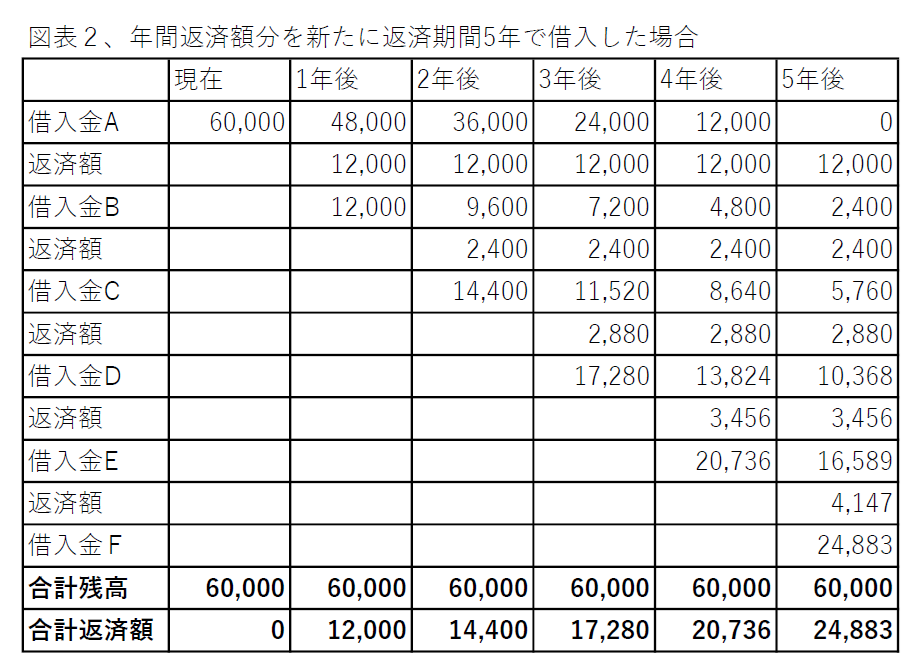 しかし、これでは資金繰りが苦しくなるからと、1年後に年間返済額分の融資を受け、それ以降も年間返済分の融資を受け続けた場合が図表2です。