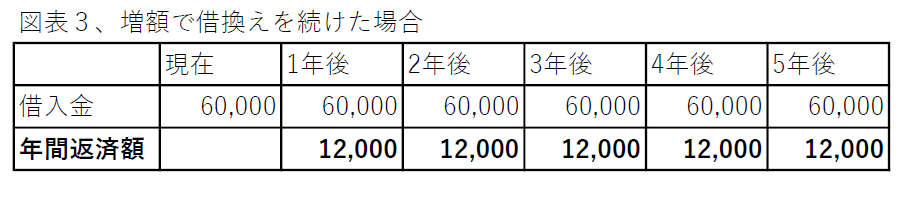図表3のように返済により減少した分を増額で借換えし続けることで、この例なら借入本数は1つのままで、年間返済額も抑えることができます。